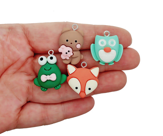 Cute Woodland Animals Charms, 6 piece Mix of Frog Owl Bear and Fox