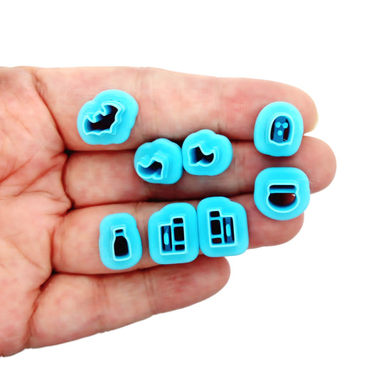 Small cutters for polymer clay or air dry clay creations: earrings, pendants, jewelry charms and miniatures. Themes include Christmas, Easter, Valentine's Day, Halloween, cute animals, and more.