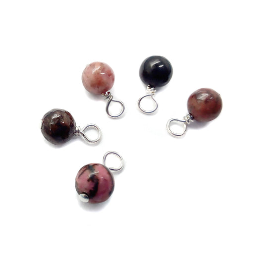 Rhodonite 6mm Bead Charms, Pink & Black Gemstone Dangles, 10 pc
