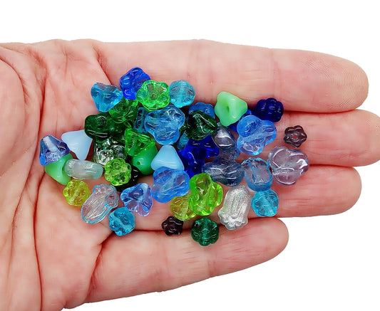 Blue & Green Glass Flower Bead Mix, 50 pieces, Assorted Styles