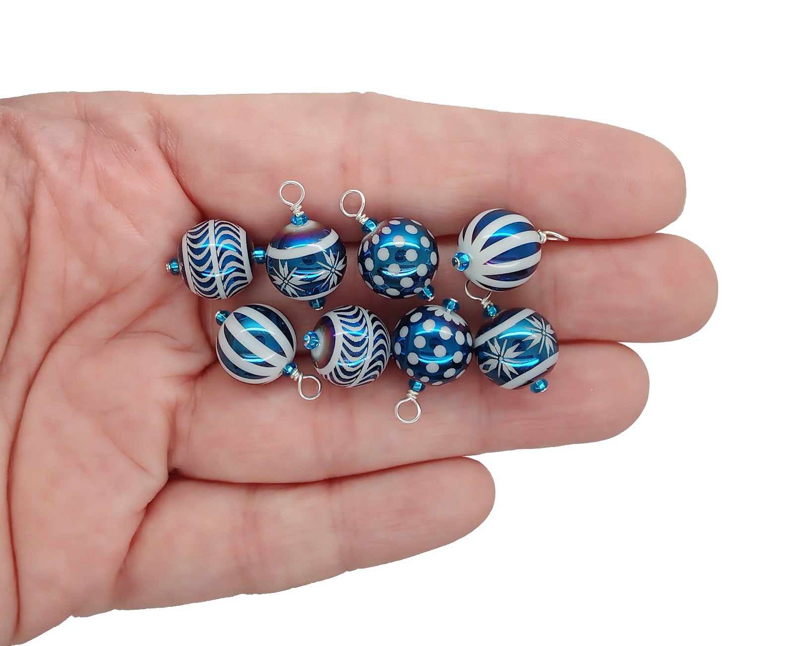 This set of miniature Christmas ornaments includes 8 pieces: a mix of the blue patterns shown. The ornaments are handmade with pretty 10mm glass beads, glass seed beads and jewelry wire. They measure about 5/8" long, and are perfect for 1:6 and 1:12 scale dollhouse or tabletop mini trees.