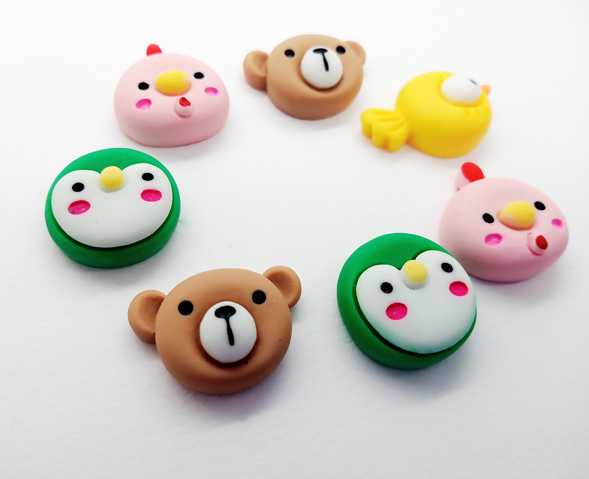 This set of 6 kawaii resin flatbacks include a mix of the cute animal faces shown: bears, chickens, birds and penguins.