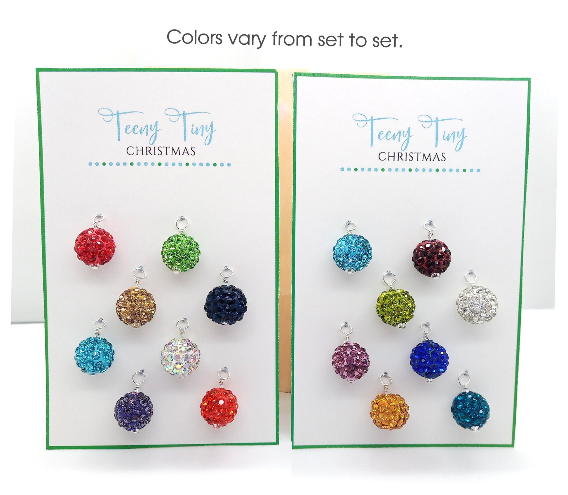 This set of miniature Christmas ornaments includes 8 pieces: a mix of colors including white, red, green, blue, aqua, gray, brown, orange, yellow and purple.