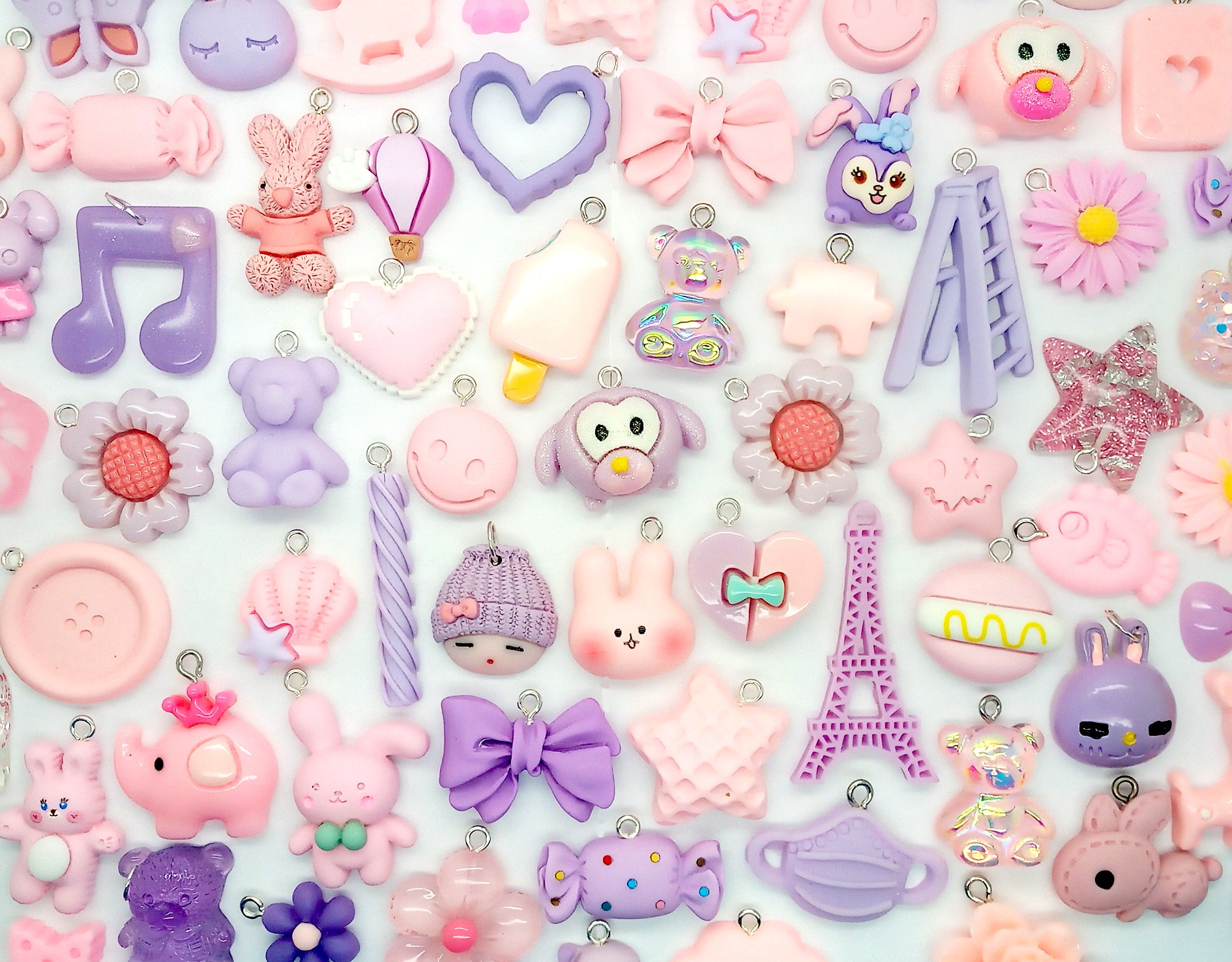 These grab bag sets of pink and purple charms come in mixed packs of 20 pieces. These adorable pastel charms are made from flatback resin cabochons. Loops have been added to them for hanging. The sizes vary: from about 1/2" to 2" long.