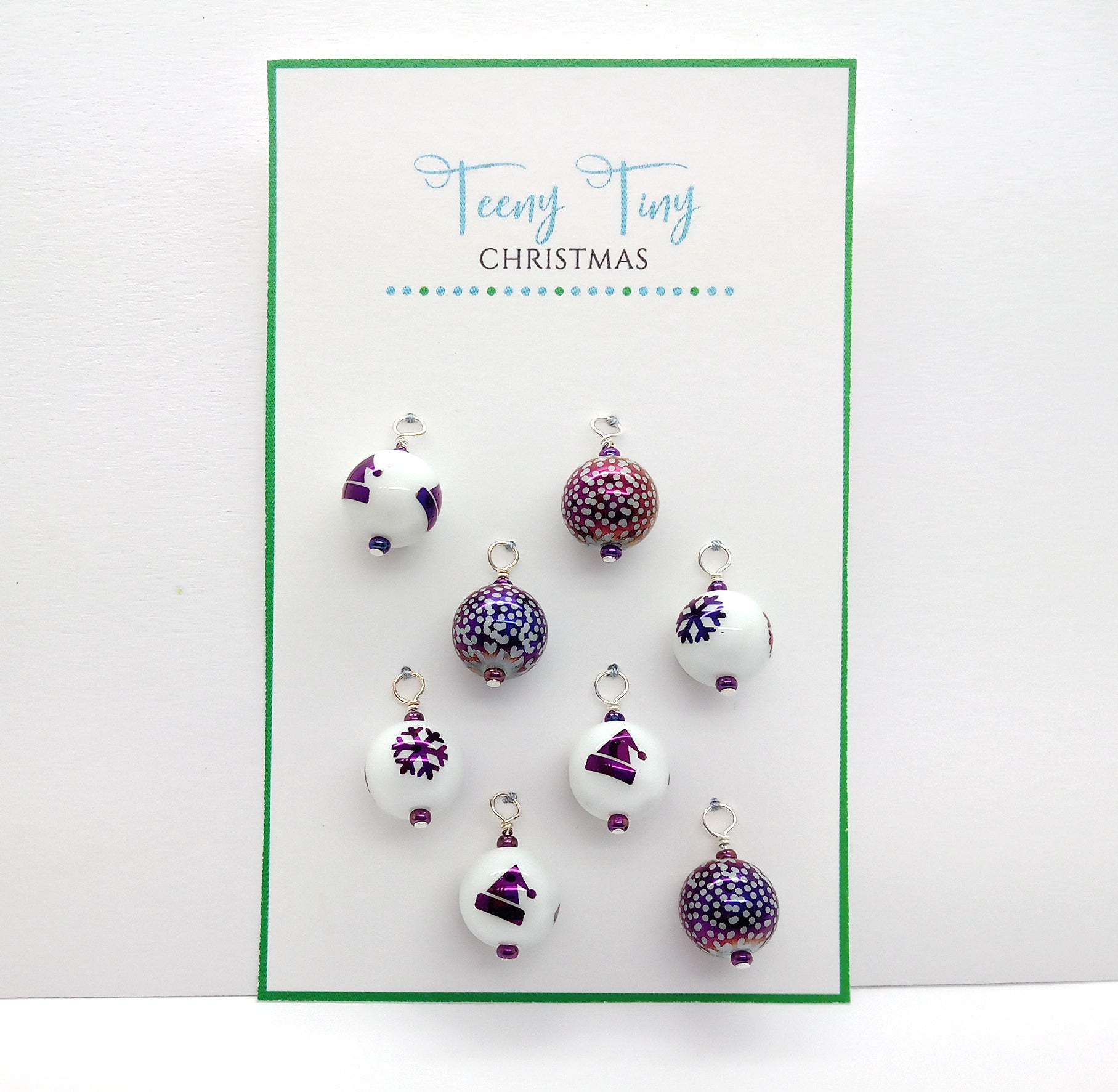 This set of miniature Christmas ornaments includes 8 pieces: a mix of purple Santa hats, snowflakes, and dot patterns. The ornaments are handmade with pretty 10mm glass beads, glass seed beads and jewelry wire. They measure about 5/8" long, and are perfect for 1:6 and 1:12 scale dollhouse or tabletop mini trees.